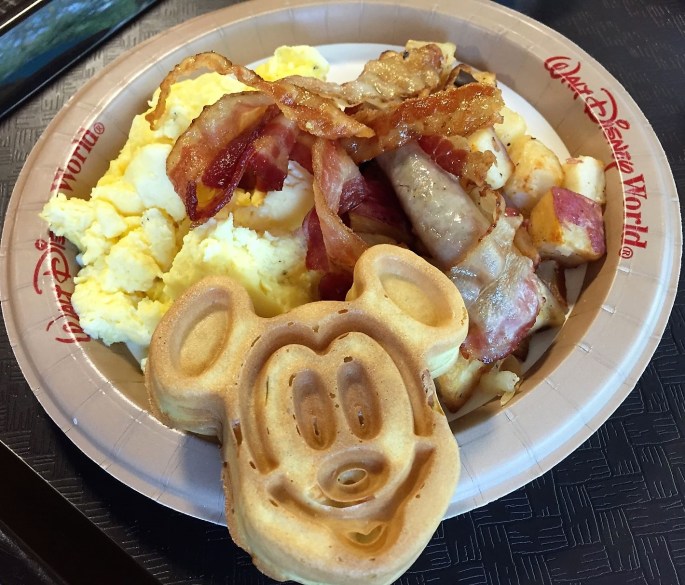 Nossa escolha para o desjejum foi na maioria das vezes o Bounty Platter (Ovos mexidos, batatas assadas, bacon, linguiça e um waffle no formato do Mickey). Além dos pratos prontos, há uma padaria com opções de pães, bolos e donuts. Também são comercializados snacks, bebidas e algumas frutas avulsas.