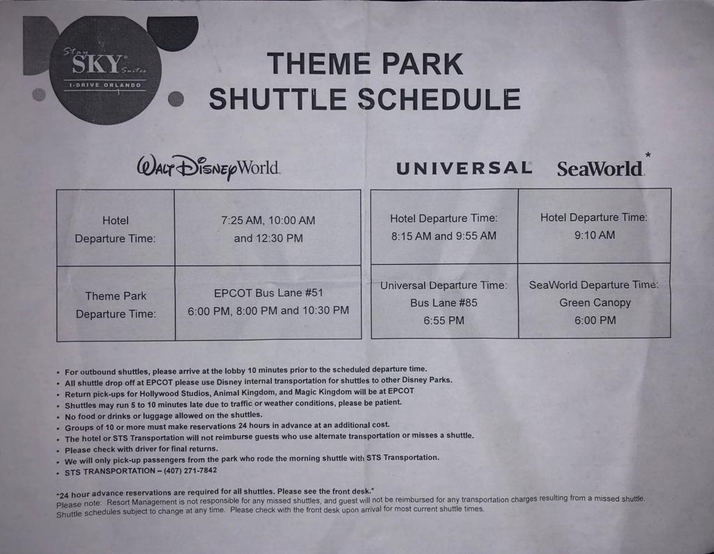 Regras e horários do serviço de traslado para os parques, disponíveis na data da nossa visita.
