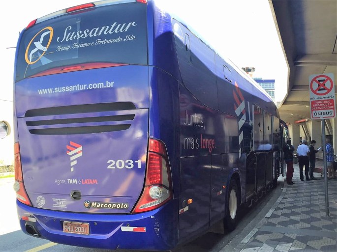 Caso perceba que não chegará em tempo hábil para o seu voo, procure outra alternativa. Nós, por exemplo, pegamos um trânsito bem tranquilo na ida, num trajeto que durou aproximadamente uma hora. Já na volta, o ônibus estava lotado quando chegamos no ponto de partida. Tivemos que aguardar a próxima saída e enfrentamos a hora do rush, que aumentou em 40 minutos o tempo do percurso. Após muita correria, chegamos ao balcão no último minuto.
