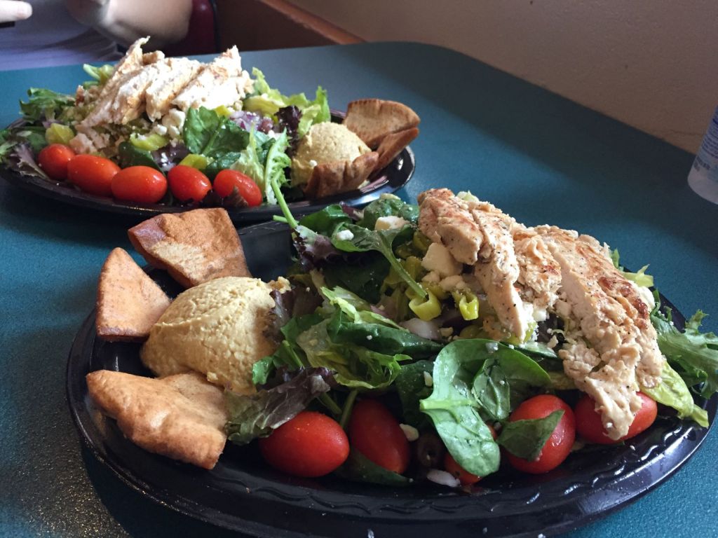 Nossa escolha foi salada mediterrânea com frango, cada prato custou U$ 12,99 + taxa.